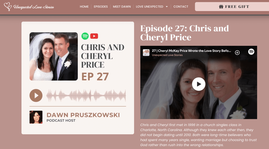Award-winning writer and screenwriter Cheryl McKay Price joins Unexpected Love Stories with her husband Chris to share how decades of waiting led to a real-life love story that unfolded in ways she never could have planned. Cheryl is the author of Finally the Bride and co-author of Never the Bride—two books born out of her own long season of singleness, faith, and surrender. In this conversation, Chris and Cheryl talk openly about waiting, reconnecting after many years, and what it’s like to watch God weave together a story far bigger than either of them expected.