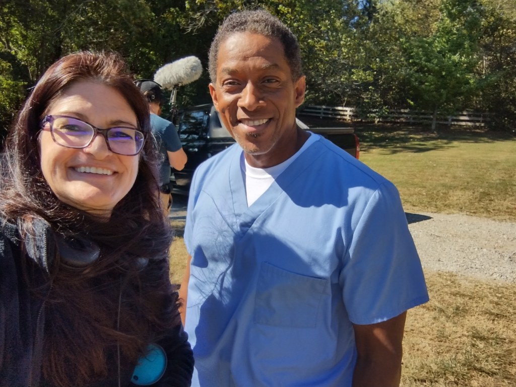 Cheryl on the set of a TV Series she wrote called THESE STONES, with Cameron Arnett, who plays Aaron.